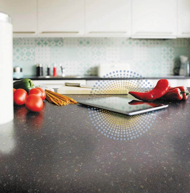 Et la couleur dans tout ça ? « Hier encore, les teintes foncées étaient très compliquées à utiliser, avec des micro rayures visibles qui accrochaient la lumière. Aujourd’hui, l’innovation Corian® DeepColorTM Technology a résolu ce problème. Dorénavant, plus de 50 coloris peuvent être utilisés, jusque dans les éviers. Ce qui retient l’attention de Christophe aujourd’hui, ce sont les imitations pierres qui déferlent dans cet univers : Marbre, granit, quartz… les décors sont bluffants. » DuPontTM Corian® va même plus loin et intègre aujourd’hui une unité de recharge sans fil pour les smartphones et tablettes utilisant la technologie de l’induction. Le Solid Surface n’a pas fini de faire parler de lui !