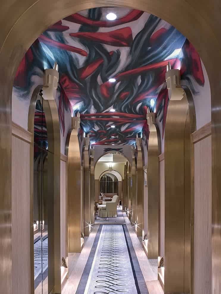 Ce n’est pas un hôtel, c’est un songe éveillé. Le décor est planté… et somme toute assez osé. Murs jaune layette aux fausses moulures dessinées au pinceau – dont les motifs sont en partie repris sur les tapis Pierre Frey – ou encore plafonds aux allures fauvistes dialoguent avec les arches de l’édifice soulignées de laiton, parfois bardées de miroirs biseautés fabriqués spécialement par des artisans français, et surplombées d’appliques puisant leur inspiration dans un bestiaire presque sorti des années 1980.