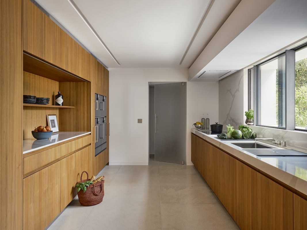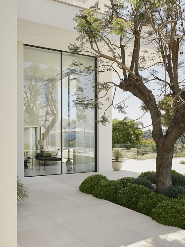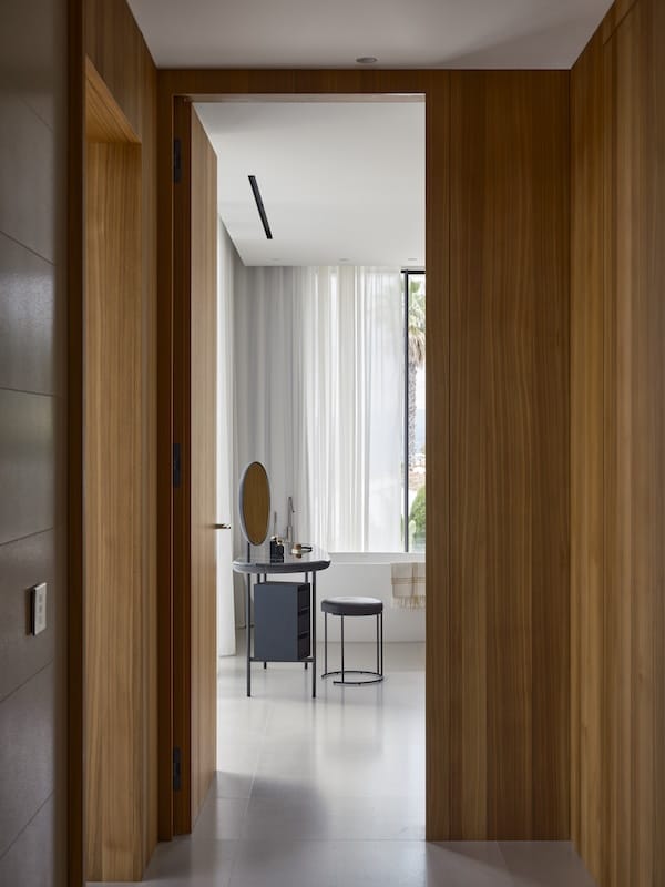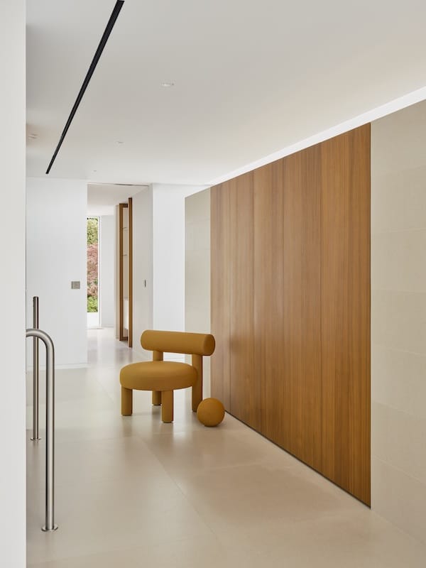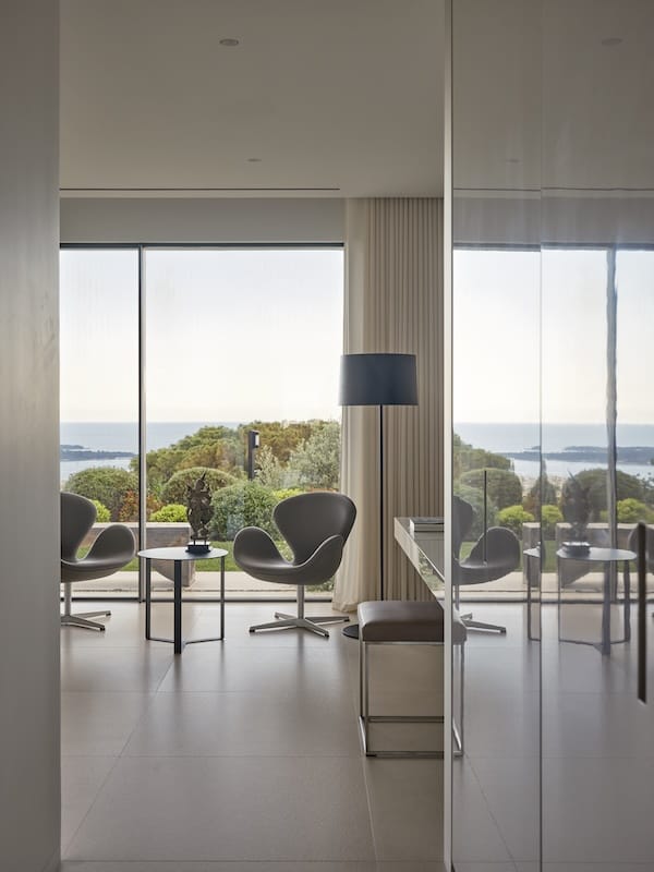 Dans ce cadre, l’architecture se met au service de la contemplation. Dans cette veine, les matériaux se mettent au pas. Eduardo confirme : La recherche de synthèse a guidé l’ensemble du processus. Face à un contexte aussi puissant, le projet adopte une posture humble, évitant toute compétition formelle ou matérielle. Trois éléments suffisent à structurer l’univers intérieur : une pierre naturelle, San Bastiano de Croatie, utilisée de manière continue pour les sols et les murs. Une seule essence de bois, le noyer européen, présente dans les parements et le mobilier intégré. Et ces aplats de blancs, qui unifient, apaisent et amplifient la lumière naturelle. La synthèse s’exprime aussi dans la conception technique et spatiale, une modulation rigoureuse fondée sur une trame de 90 × 90 cm, qui organise l’ensemble des éléments du projet. De la distribution des volumes jusqu’au tracé des luminaires au plafond, tout répond à cette logique de contrôle et d’harmonie.