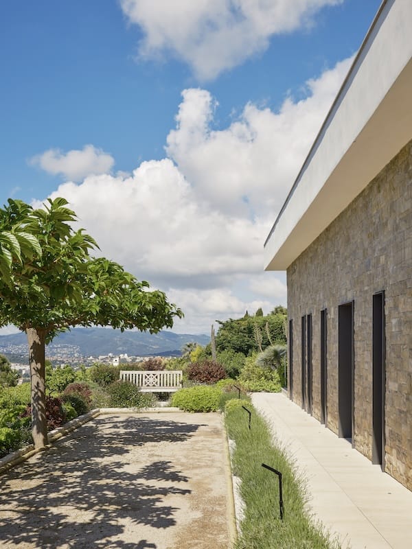 Mais l’épure n’exclut pas la poésie. À l’entrée, un mur minéral en biais rompt la géométrie pour ouvrir la vue vers un bassin miroir, puis vers les collines de l’Estérel. Un geste inaugural qui concentre l’intention générale du projet : une architecture sobre et orientée. À l’intérieur, les cloisons deviennent des formes silencieuses, dessinant l’espace avec retenue. Chaque perspective est construite. Il y a toujours un objet ou une œuvre qui aimante l’œil. Une ponctuation visuelle qui nous attrape. Ces axes jouent un rôle de fil conducteur, reliant les différentes fonctions de la villa tout en maintenant une connexion constante au site et à la mémoire intime de ses habitants.