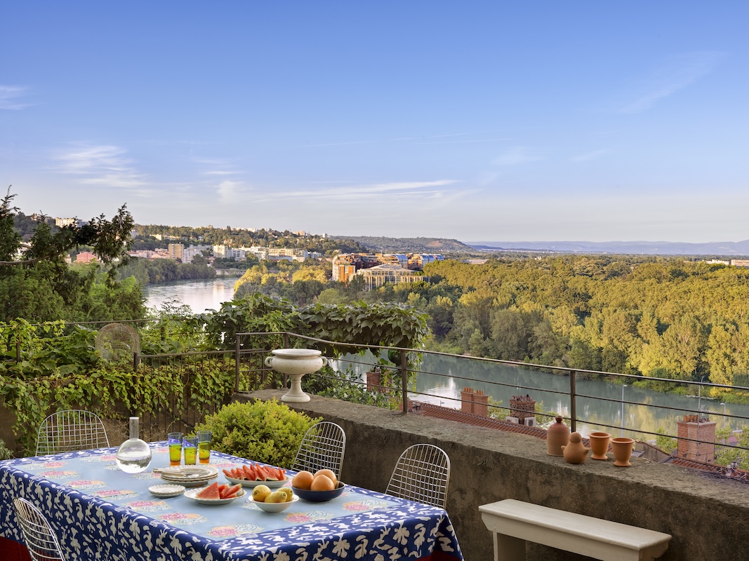 Dans cette logique, l’extérieur et cette vue panoramique s’inscrivent comme le dernier tableau ou le premier ! La terrasse devient belvédère ; une scène ouverte sur un paysage lyonnais rêvé. Puis le jardin se déploie par paliers, épousant la colline jusqu’aux caves voûtées réinvesties. La topographie impose ses lois et rappelle combien ce projet s’est construit au plus près du geste. À Margaux de conclure : Notre travail a été d’accompagner et de guider nos clients qui souhaitaient explorer notamment l’univers des arts décoratifs. Ces contrastes donnent naissance à un projet singulier au charme unique qui est une prolongation de la personnalité de cette famille.