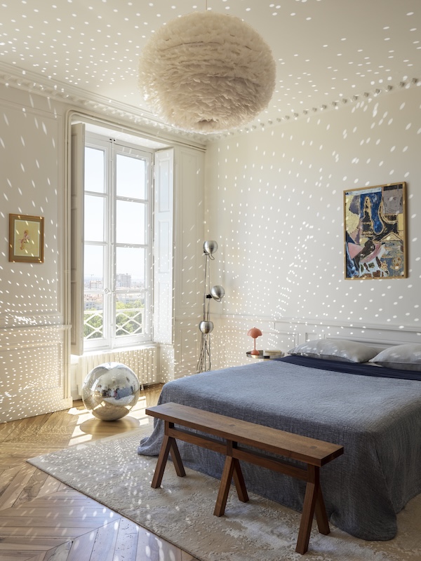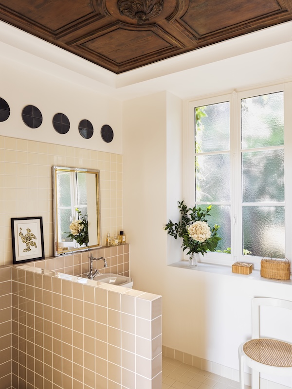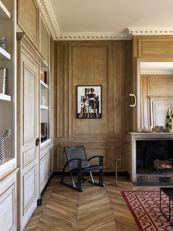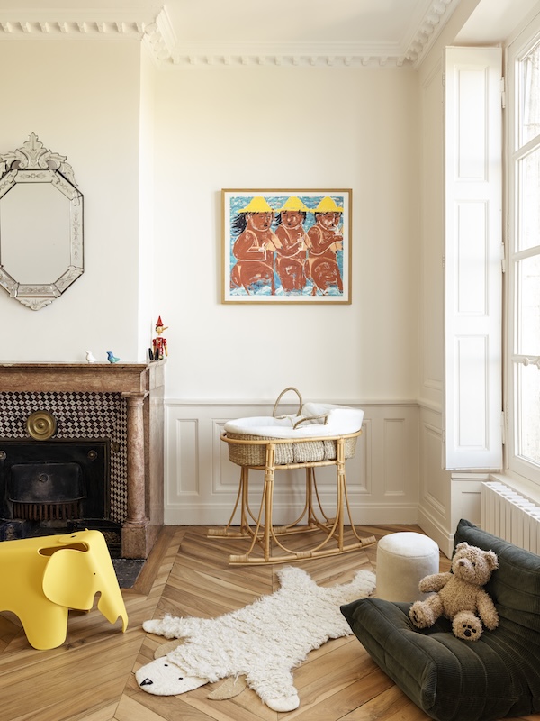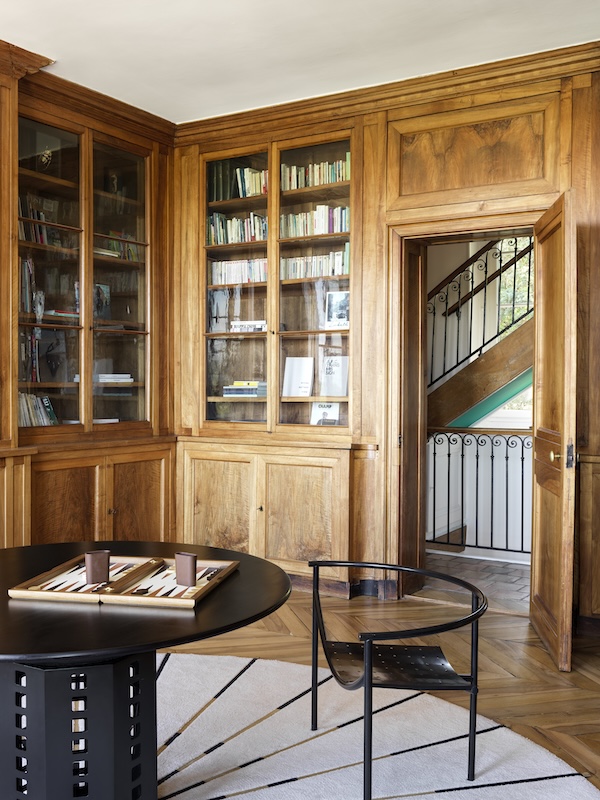 Le premier étage bascule vers la sphère familiale : deux chambres d’enfants et un bureau qui se vit aussi comme salon de jeu, au milieu des livres et des bibliothèques. Le second niveau devient celui des parents, avec une suite parentale. Ce plan clarifie également la manière dont le regard circule. L’axe visuel se tend vers les ouvertures et le panorama, comme une respiration régulière qui traverse la maison. Les interventions se concentrent ensuite sur un agencement sur mesure, des tonalités adoucies, des finitions d’orfèvre et la mise au point des détails minutieux. Dans ce réglage millimétré, l’artisanat devient langage et occupe une place structurante, chère à notre duo. À l’image des boiseries restaurées à la teinte réactualisée. Luc cite Françoise Foraison, peintre en décor et précise l’intention : uniformiser avec un badigeon légèrement blanc pour avoir cette sensation que ça a toujours été là.