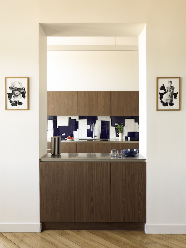 Une note boisée qui inspire la cuisine dans un registre plus contemporain. Noyer pour la profondeur, inox brossé pour la précision. Et surtout, cette crédence qui fait basculer la pièce dans une présence presque picturale, en écho à la sensibilité artistique des propriétaires. Mais pas n’importe quelle crédence. Margaux détaille la prouesse : de la lave émaillée déroulée sur plus de quatre mètres de long, réalisée par l’atelier d’émaillage breton Studio Ler.