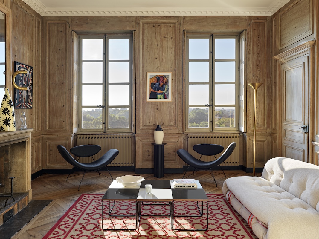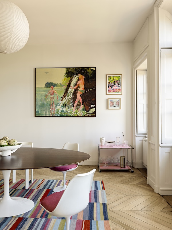 Au diapason, le mobilier accompagne le lieu dans le XXe siècle, oscillant entre pièces chinées dans les galeries, ameublements sélectionnés dans les showrooms contemporains et compléments choisis dans la continuité d’une famille à contre-courant. À l’image de la salle à manger qui porte en elle les exigences des propriétaires, un goût affirmé pour le design moderniste, au-delà des décennies. Luc Berger le dit clairement : L’intérêt se porte moins sur une époque que sur des signatures tout simplement intemporelles. À l’instar de l’intégration de la collection d’art des propriétaires incarnés par des médiums pluriels – peintures, lithographies, collages papier, etc. Les œuvres ponctuent, répondent aux couleurs, prolongent les lignes, comme autant de repères sensibles qui ancrent l’univers de cette famille dans l’épaisseur du bâti. Elles donnent le tempo, aiguisent le regard et figurent ce fil entremêlé qui traverse le projet sans contredire le XVIIIe siècle.