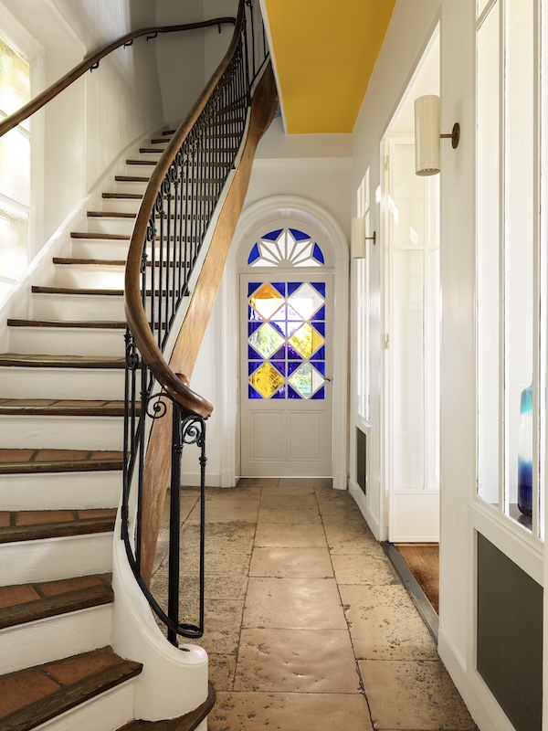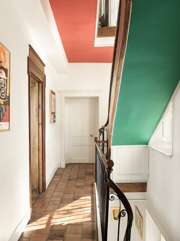 Premier point d’attache, le vitrail. Une présence lumineuse qui tient lieu de boussole et qui autorise un parti pris fort : faire de la couleur un appui spatial, un liant. L’escalier d’origine, visible depuis chaque pièce, devient dès lors une toile créative où les teintes primaires, choisies par les propriétaires et extraites des dalles de verre, apprivoisent cette envolée de quatre étages. Les couleurs sinueuses s’assument, franches, créant en sous-face une autre grammaire de cette trémie qui s’éveille : un jaune vif, un vert intense, un rouge orangé. Non pour « décorer », mais pour signer le présent face au patrimoine. Chaque étage s’épanouit à son rythme. Le rez-de-chaussée rassemble les pièces de vie, cuisine, salle à manger, avec, en contrepoint, un salon plus intime blotti au coin de la cheminée.