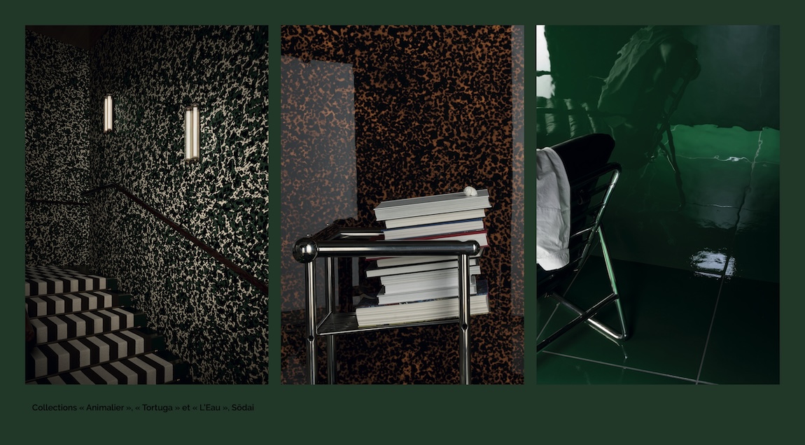 Avec Tortuga, Animalier et L’Eau, la jeune marque Sōdai, satellite audacieux de 41zero42, explore trois expressions sensuelles de la surface céramique. Tortuga évoque l’écaille des lunettes vintage, des peignes art déco et des poignées de sacs d’époque, entre esthétique rétro et esprit pop. Animalier relit l’élégance bourgeoise des tapisseries à motifs, délaissant l’imitation pour atteindre l’abstraction, dans une matité presque veloutée qui rappelle les intérieurs des années 1970. L’Eau restitue la suspension d’une surface à peine ondulée, où la lumière glisse en reflets discrets et profonds, comme sur une piscine à débordement baignée de soleil méditerranéen. Sōdai