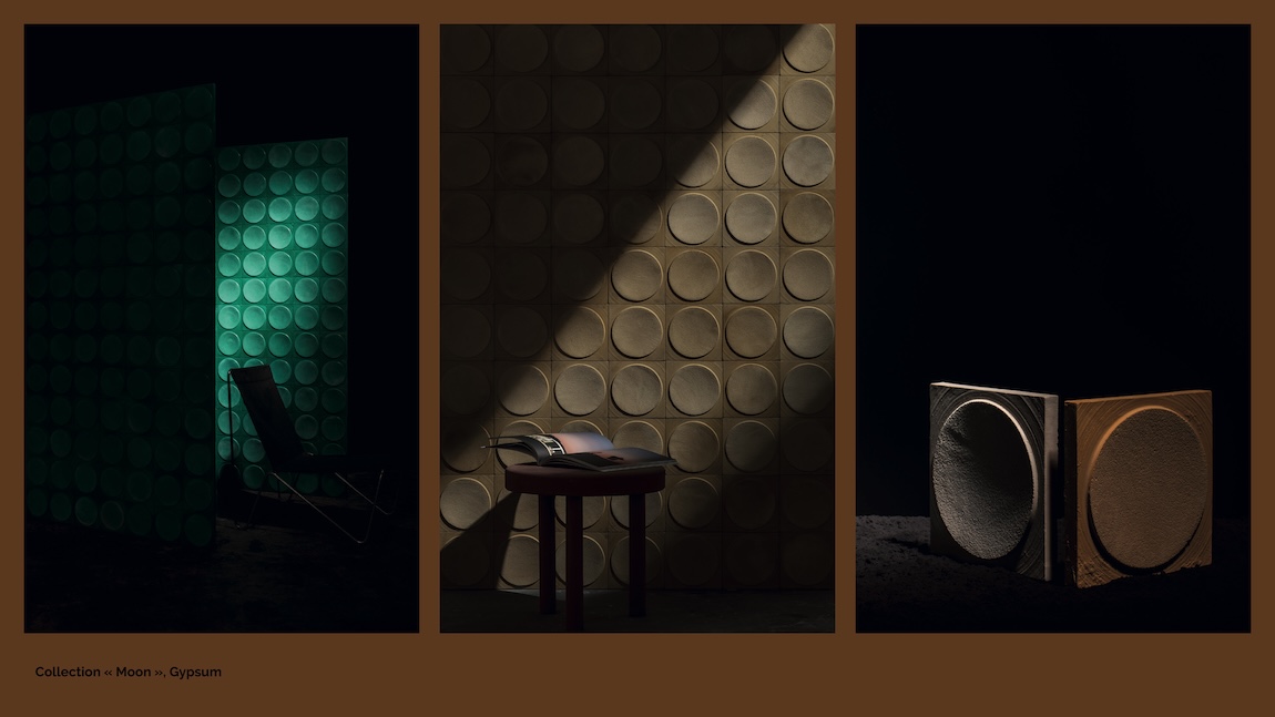 Signée Marco Merendi et Diego Vencato, la collection Moon révèle la face sensible du béton. Chaque carreau de 15 x 15 cm associe une base lisse, finement striée de cercles concentriques, à un centre en léger relief, plus brut, presque granuleux. Ce double traitement capte la lumière, fait vibrer la matière et introduit une profondeur inattendue. Déclinée en cinq teintes – aubergine, moutarde, vert, sable clair et anthracite – Moon traduit la recherche constante de Gypsum autour du béton comme surface expressive. Intégralement teinté dans la masse et protégé par un traitement hydrophobe et oléophobe, le matériau conjugue esthétique et performance, pour des applications murales intérieures comme extérieures. Gypsum