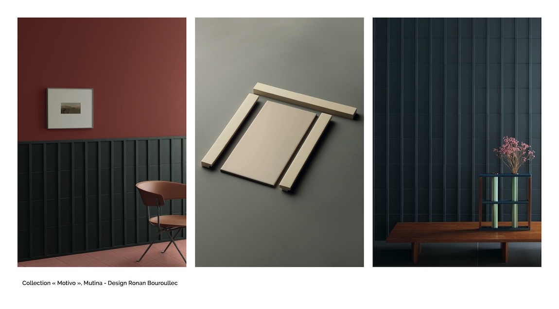 Imaginée par Ronan Bouroullec, Motivo introduit une nouvelle lecture du relief céramique. Conçue pour le mur intérieur, la collection associe carreaux émaillés mats de 14 × 28 cm et listels de 2,8 × 28 cm (L, T et Terminale), permettant de composer des parois rythmiques et graphiques. Réalisée en double cuisson émaillée et déclinée en six teintes – White, Chalk, Limestone, Earth, Arctic et Graphite – avec une version à lustre argenté (Silver),Motivo traduit l’équilibre précis entre géométrie, lumière et matière, dans la continuité du travail sensible du designer autour de la surface architecturale. Mutina