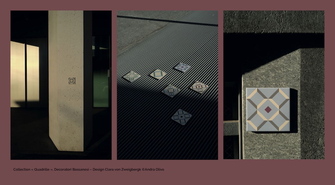 Signée Clara von Zweigbergk, Quadrille explore l’équilibre entre géométrie et couleur. Inspirée de la danse française du même nom, la collection transpose ses figures chorégraphiques en motifs graphiques, créant des surfaces rythmées et légères. Six dessins, déclinés dans une palette subtile – bordeaux velouté, vert forêt, bleu poudré – composent un jeu visuel à la fois structuré et fluide. Réalisés en grès cérame émaillé au format 15 × 15 cm, les carreaux renouvellent l’héritage décoratif de la marque, entre modernité graphique et mémoire artisanale. Decoratori Bassanesi