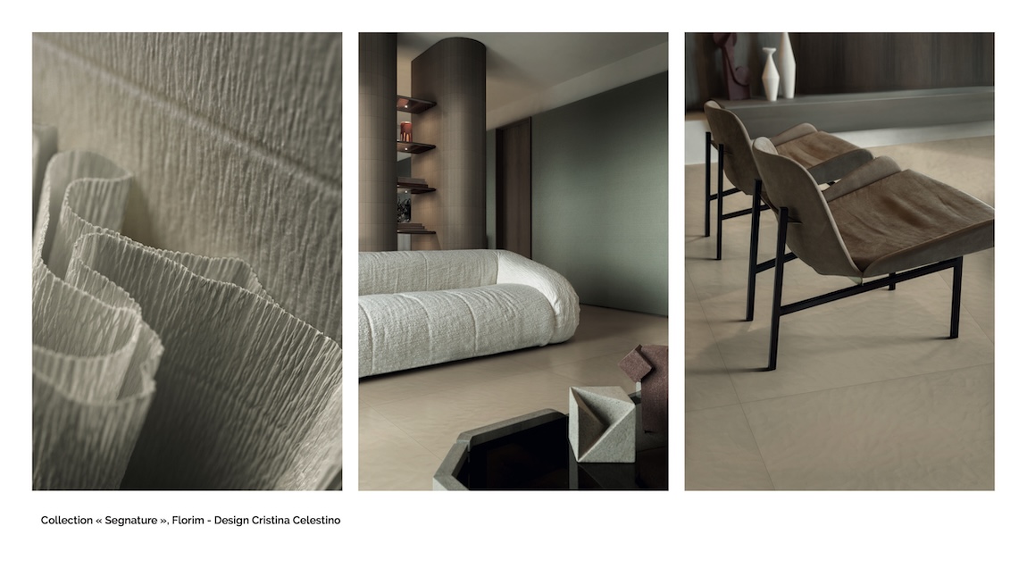 Deuxième collection dessinée par Cristina Celestino pour CEDIT, Segnature s’inspire des trames végétales et du papier crépon pour explorer le lien entre signe et surface. Les textures fines, presque impalpables, révèlent des motifs qui captent la lumière et transforment la perception du grès. Déclinée en deux esthétiques – Fibra, aux six tonalités chaudes et naturelles, et Foglio, aux quatre nuances neutres adaptées aux sols comme aux murs – la collection joue sur la subtilité du relief et la profondeur visuelle. À travers une démarche durable et technologique, Segnature conjugue rigueur et sensibilité, prolongeant la recherche poétique de sa créatrice autour de la matière et du geste. CEDIT – Florim